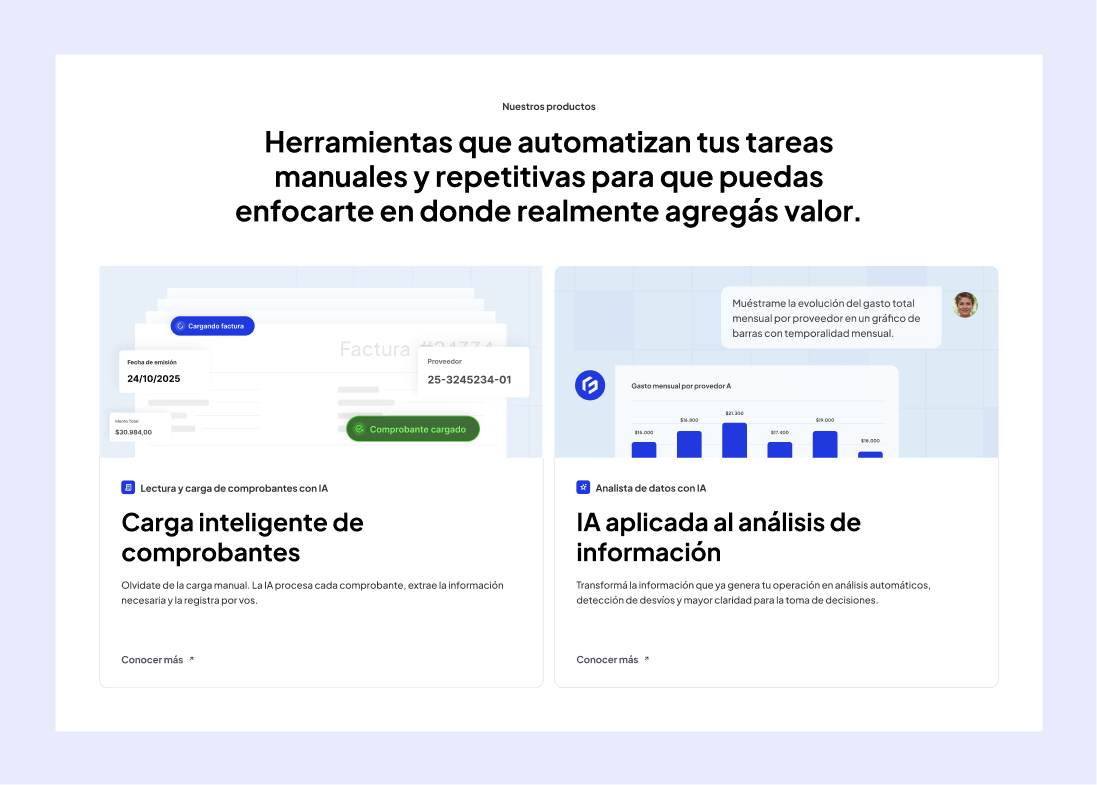 Trabajamos una estética limpia en tonos azules, blancos y negros, priorizando espacio, orden y legibilidad para transmitir confianza en un entorno B2B.